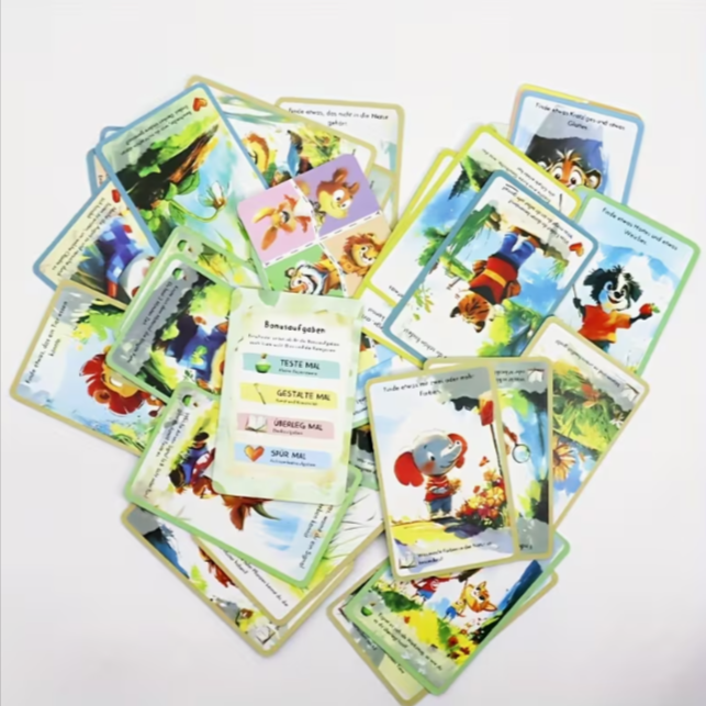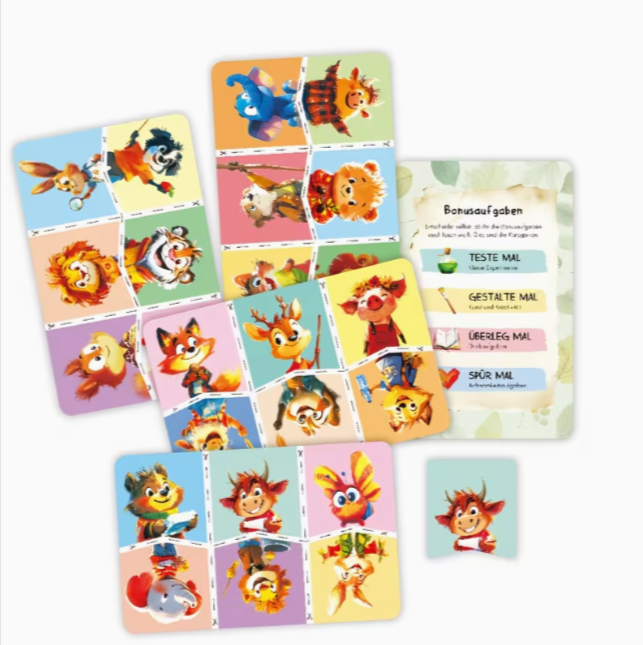 - Bonuskarten mit kreativen Impulsen: Teste mal, Gestalte mal, Überleg mal, Spür mal