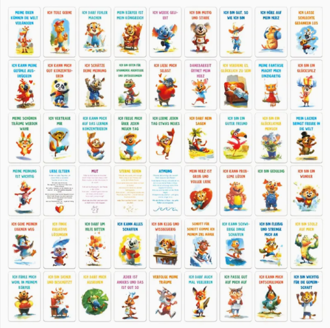 - 50 Karten mit verschiedenen Affirmationen und liebevollen Tier-Illustrationen