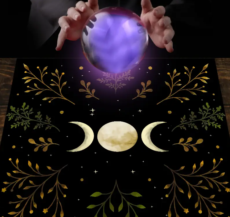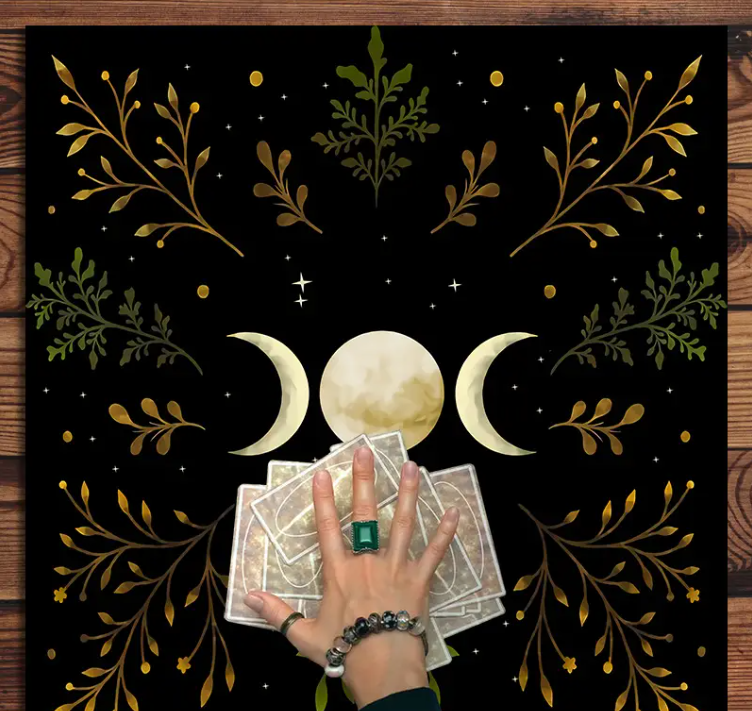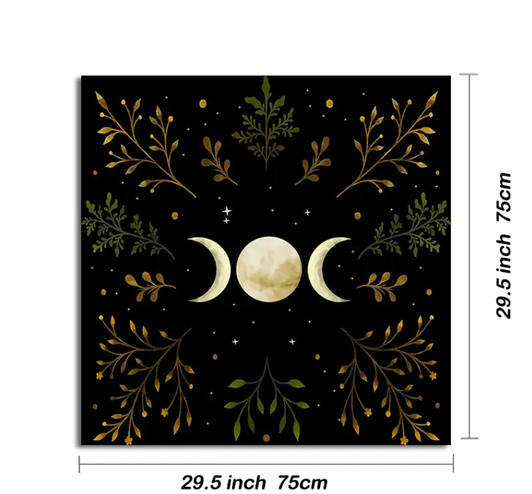 Entdecken Sie unsere wunderschöne Triple Moon Tarot Tischdecke, die perfekt für Ihre Wicca- und Hexenrituale ist. Mit einem mystischen Design, das Olivenblätter und Blumen umfasst, bringt diese Tischdecke eine magische Atmosphäre in Ihr Zuhause.