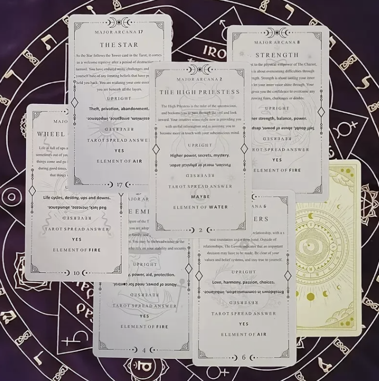 Ausstattung: 78 Tarotkarten mit Bedeutungen auf jeder Karte